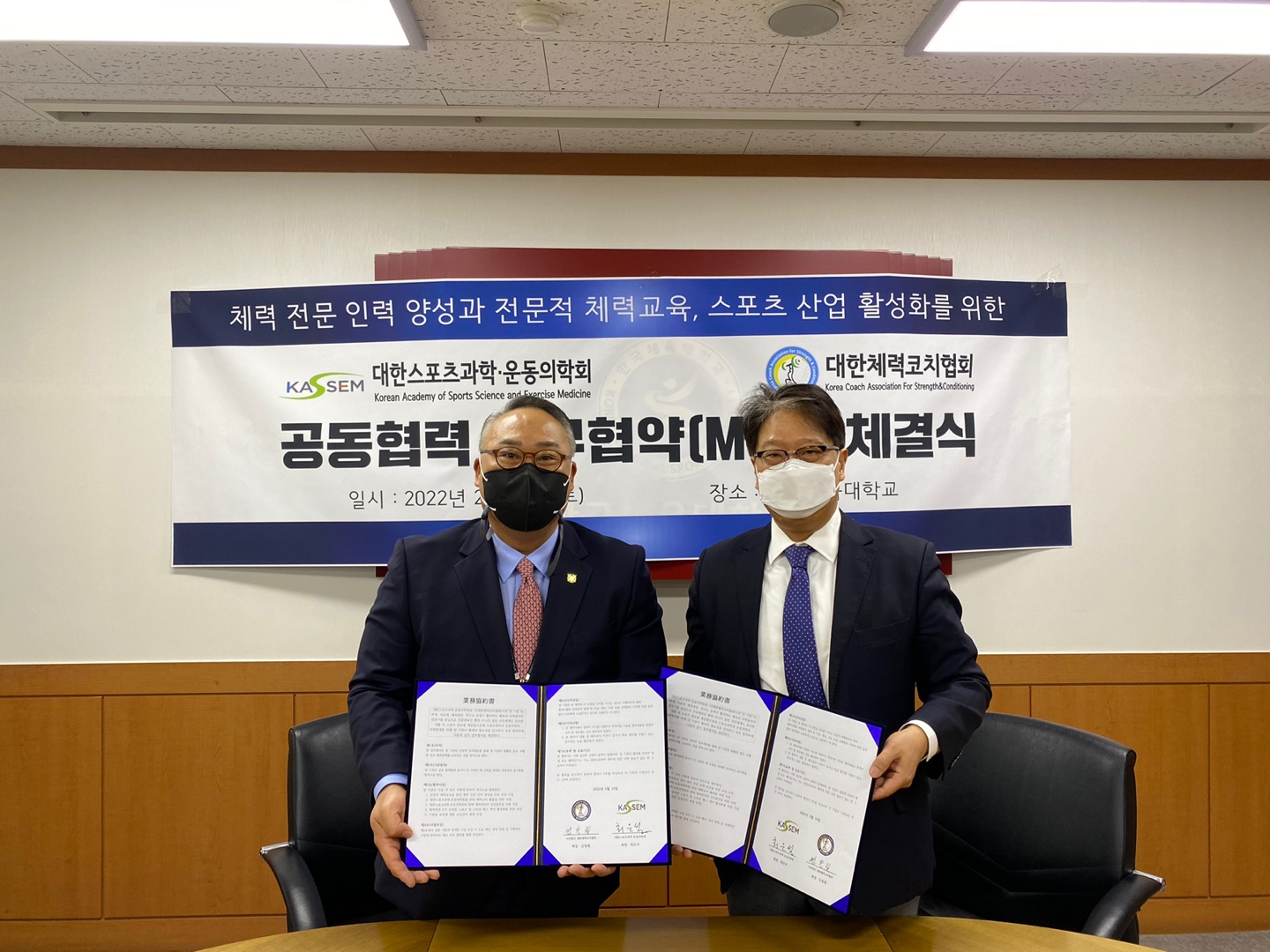 대한스포츠과학·운동의학회와 사)대한체력코치협회는 학계, 의료계, 체육현장, 연구소 등에서 활약하는 체육과 의학분야의 전문가를 중심으로 전문체육인 뿐만 아니라 일반 국민에게도 유익한 생활 속 스포츠 정보를 제공함으로써 스포츠과학과 운동의학의 저변확대를 위해 양 기관이 협력의 필요성을 인식하고 상호 합의하에 업무협약을 체결 하였습니다.